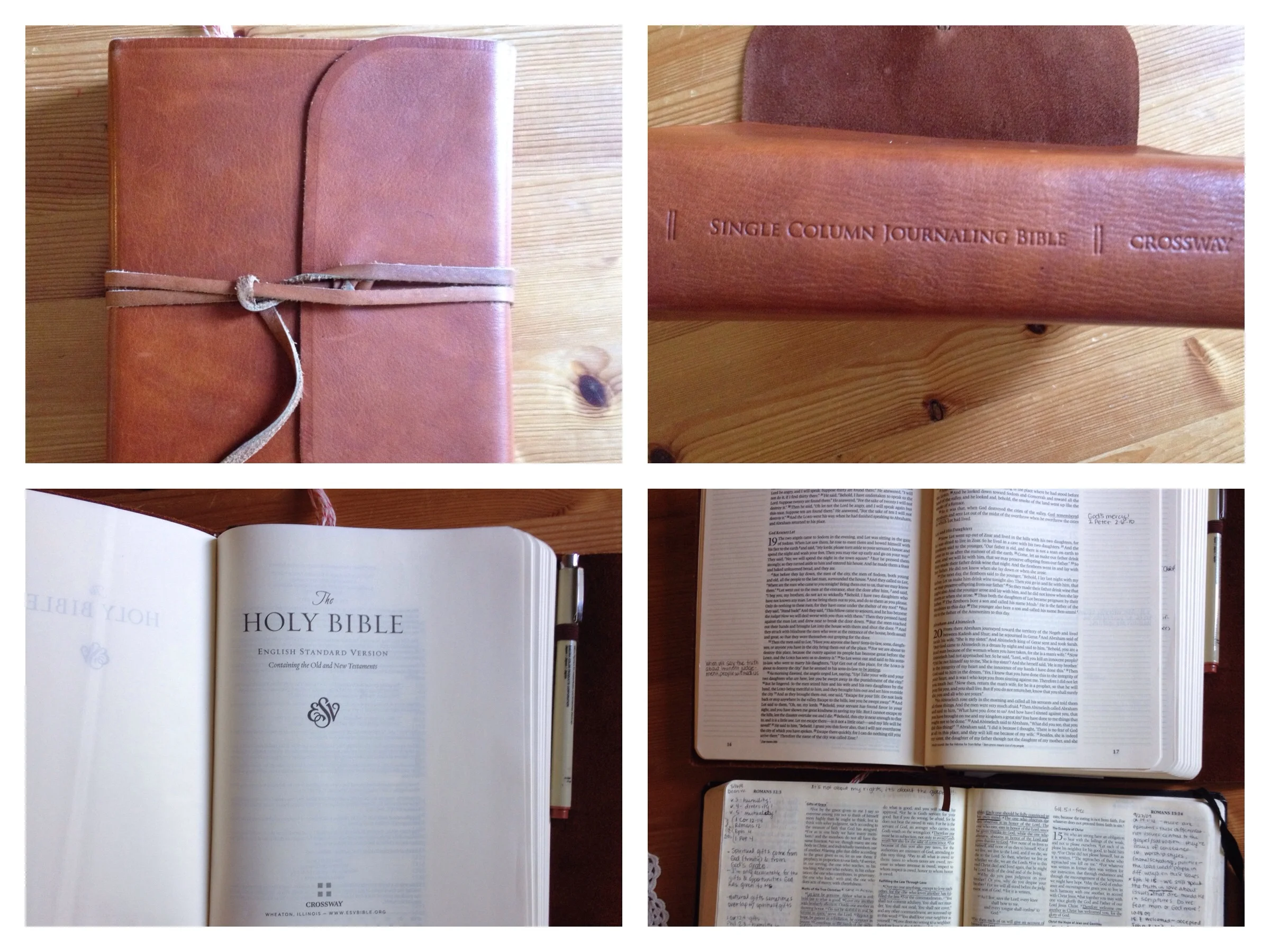 I've been using a Crossway journaling Bible over six years now, but just this year I upgraded to a real leather version with a single column of text instead of a double column (bottom right photo above shows compares the two). I feel like the text lines up with my notes better with the single column. I've always been a verse-underliner and love inserting interesting notes so this Bible is really perfect for me. I hope it lasts me for many, many years, and gets super worn with lots of notes. There's nothing better than a worn, well-loved Bible.